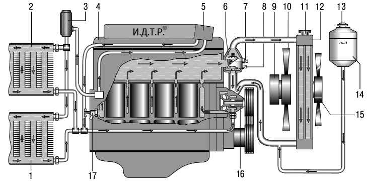 1, 2 – радиаторы отопителя; 3 – электронасос; 4 – двигатель; 5 – дроссельный патрубок; 6 – термостат; 7 – датчик указателя температуры охлаждающей жидкости; 8 – датчик сигнальной лампы перегрева охлаждающей жидкости; 9 – вязкостная муфта привода вентилятора; 10 – вентилятор; 11 – пробка радиатора; 12 – радиатор; 13 – пробка расширительного бачка; 14 – расширительный бачок; 15 – электровентилятор; 16 – водяной насос; 17 – сливной кран блока цилиндров. Система охлаждения УАЗ состоит из рубашки охлаждения двигателя, радиатора, водяного насоса, термостата, расширительного бачка, вязкостной муфты привода вентилятора, электровентилятора, соединительных шлангов и трубок. К системе охлаждения также подсоединены радиаторы отопителей и электронасос дополнительного отопителя салона. Давление в системе создается водяным насосом, который приводится в действие ремнем от коленчатого вала.