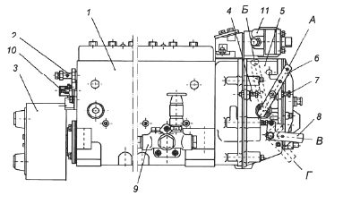 1 – топливный насос высокого давления; 2 – перепускной клапан; 3 – демпферная муфта; 4 – болт ограничения максимальной частоты вращения; 5 – регулятор частоты вращения; 6 – рычаг управления регулятором; 7 – болт ограничения минимальной частоты вращения; 8 – скоба останова; 9 – топливоподкачивающий насос; 10 – болт регулировки пусковой подачи; 11 – корректор подачи топлива по наддуву.