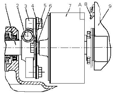 Рис. 1. Привод топливного насоса высокого давления двигателей ЯМЗ-238БЕ2 и ЯМЗ-238ДЕ2: 1 — ведущая полумуфта; 2 — болт клеммового соединения; 3 — фланец полумуфты; 4 — пластины привода; 5 — болты крепления пластин привода; 6 — шайбы; 7 — демпферная муфта; 8 — указатель; 9 — топливный насос высокого давления; А — метка на демпферной муфте.