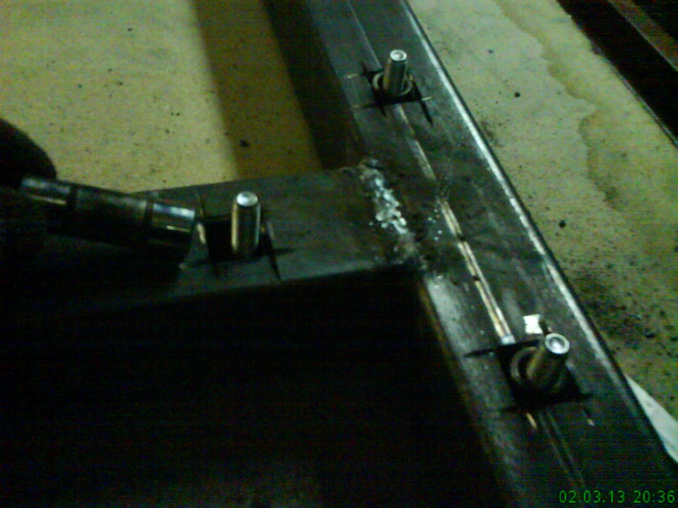 Далее там где 2 части будут прикручены болтами М12, я в профиле болгаркой сделал 3 окна на фото видно, и вставил втулки (очень хорошо подошли поршневые пальцы от вазовского двигателя) всё это дело хорошенько приварил.