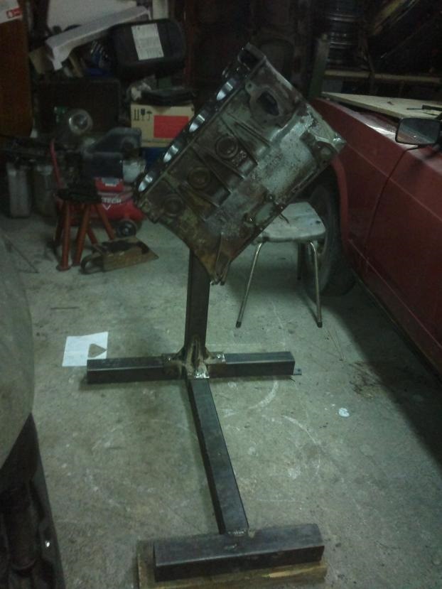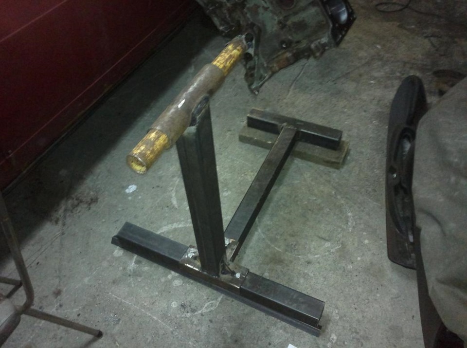 Стенд для ремонта двигателя — приспособление, на котором закрепляется силовой агрегат после извлечение из моторного отсека автомобиля. Данное решение позволяет значительно упростить процесс очистки и осмотра, а также разборки, дефектовки и проведения ремонта двигателя. Также на стенде для ремонта мотора производится последующая сборка силовой установки и транспортировка в случае такой необходимости. Другими словами, производить любые работы с ДВС намного удобнее тогда, когда в автомастерской или гараже имеется разборочный — сборочный стенд для ремонта двигателя.Долго обдумывал мысль об изготовлении собственного стенда для ремонта двигателя, так как за 4 тысячи рублей покупать не захотел. Съездил купил квадратного профиля 70 х 70 (толщина 3 мм.) 3 метра, а остальное всё было. Стенд сделал разборный, чтобы когда не использую можно было его убрать на полку). Чертежей не было, но за основу нашёл в интернете похожий стенд. Сначала нарезал под нужный мне размер профиля (кому надо могу набросать размеры всей конструкции), далее на ровной поверхности были сварены. Для того что-бы конструкция получилась разборной был изготовлен кронштейн из уголка 4мм, далее всё это дело усилил косынками.