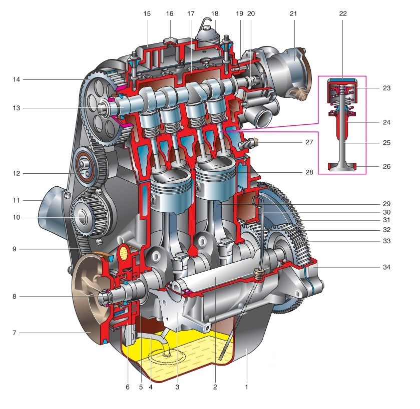 1 - поддон картера; 2 - уравновешивающий вал; 3 - блок цилиндров; 4 - маслоприемник; 5 - крышка первого коренного подшипника; 6 - масляный насос; 7 - шкив привода генератора; 8 - коленчатый вал; 9 - зубчатый ремень привода распределительного вала; 10 - зубчатый шкив насоса охлаждающей жидкости; 11 - масляный фильтр; 12 - натяжной ролик; 13 - распределительный вал; 14 - зубчатый шкив распределительного вала: 15 - крышка головки цилиндров; 16 - крышка иаспозаливной горловины; 17-корпус подшипников распределительного вала; 18 - топливный насос; 19 - корпус вспомогательных агрегатов; 20 - эксцентрик для привода топливного насоса; 21 - датчик момента искрообразования; 22 - регулировочная шайба; 23 - толкатель клапана; 24 - направляющая втулка клапана; 25 - клапан; 26 - седло клапана; 27 - датчик указателя температуры охлаждающей жидкости; 28 - поршень; 29 - шатун; 30 - указатель уровня масла; 31 - маховик; 32 - шестерня привода уравновешивающих валов; 33 - шестерня уравновешивающего вала; 34 - держатель заднего сальника коленчатого вала.