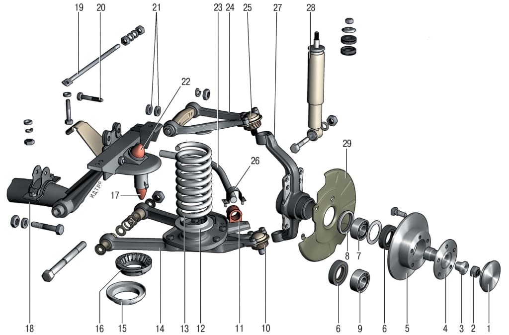 1 – колпак; 2 – гайка; 3 – центрирующая втулка; 4 – ступица колеса; 5 – тормозной диск; 6 – сальник; 7 – наружный подшипник; 8 – кольцо; 9 – внутренний подшипник; 10 – шаровая опора; 11 – втулка стабилизатора; 12 – нижняя чашка пружины; 13 – пружина передней подвески; 14 – нижний рычаг подвески; 15 – верхняя чашка пружины; 16 – прокладка пружины; 17 – буфер сжатия; 18 – поперечина передней подвески; 19 – растяжка; 20 – болт крепления верхнего рычага; 21 – регулировочные шайбы; 22 – буфер хода отбоя; 23 – стабилизатор; 24 – верхний рычаг; 25 – шаровой шарнир; 26 – скоба; 27 – поворотный кулак; 28 – амортизатор; 29 – защитный кожух переднего тормоза