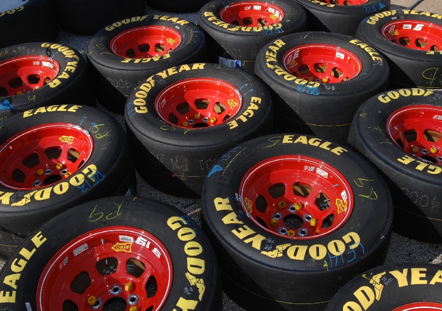 Радиальные шины должны выдерживать высокие скорости и иметь хорошие сцепные поверхности. В NASCAR используют радиальные слики которых в жестких условиях гонки хватает на 60-100 миль, при стоимости за штуку около 350$. Для скоростных трасс, обязательна установка дополнительных шин, внутри основных, что повышает безопасность при взрыве основной покрышки. Износ шин зависит от месторасположения на машине, (внешние к повороту изнашиваются гораздо быстрее) от типа трассы, от шероховатости покрытия трассы, погодных условий и др. В отличии от Формулы один, механики NASCAR должны откручивать по 5 гаек, при смене каждого колеса болида и поднять автомобиль можно только с одной стороны. В среднем им хватает 13-14 скунд чтобы сменить все колеса. Количество человек на пит - стопе ограничено семью, однако может быть задействовано и больше людей, если они не заходят за линию пит-стопа и пользуются при работах очень длинными ручками с инструментом.