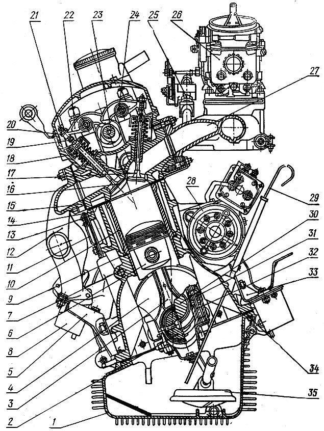 Поперечный разрез двигателя автомобиля 'Москвич-412': 1 - картер; 2 - шатунная шейка; 3 - шатун; 4 - противовес коленчатого вала; 5 - правый кронштейн передней опоры силового агрегата; 6 - поршень; 7 - горизонтальный масляный канал блока; 8 - подушка передней опоры; 9 - уплотнительная прокладка гильзы цилиндра; 10 - гильза цилиндра; 11 - крышка люка водяной рубашки; 12 - впускной трубопровод; 13 - блок цилиндров; 14 - прокладка головки блока; 15 - головка цилиндров; 16 - выпускной клапан; 17 - впускной клапан; 18 - клапанные пружины; 19 - наконечник регулировочного винта; 20 - контргайка; 21 - регулировочный винт; 22 - коромысло выпускного клапана; 23 - распределительный вал; 24 - ось коромысел впускных клапанов; 25 - кран отопителя кузова; 26 - карбюратор; 27 - впускной трубопровод; 28 - стартер; 29 - маслоизмерительный стержень; 30 - коренная шейка коленчатого вала; 31 - полый штифт; 32 - шпилька крышки коренного подшипника; 33 - левый кронштейн передней опоры силового агрегата; 34 - прокладка картера; 35 - маслоприемник масляного насоса.