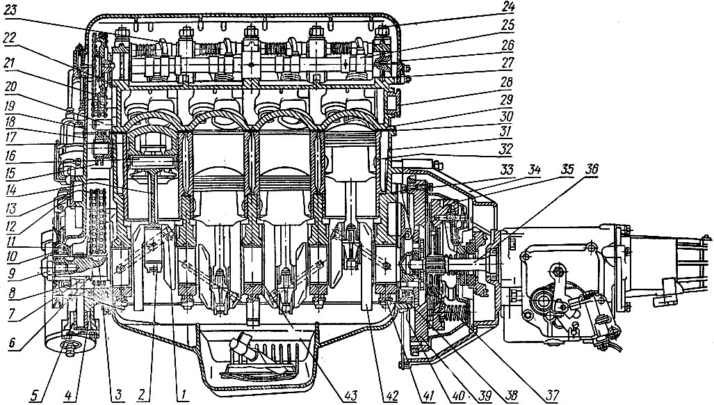 Продольный разрез двигателя автомобиля 'Москвнч-412': 1 - пробка; 2 - шатунные вкладыши; 3 - сегментная шпонка; 4 - ведущая звездочка газораспределительного механизма; 5 - масляный насос; 6 - распорная втулка; 7 - ведущая шестерня привода масляного насоса и распределителя зажигания; 8 - маслоотражатель; 9 - храповик; 10 - шкив; 11 - передний сальник; ,12 - крышка водяного канала; 13 - цепь привода газораспределительного механизма; 14 - шатун; 15 - натяжная звездочка; 16 - поршневой палец; 17- поршень; 18 - нижняя крышка привода газораспределительного механизма; 19 - верхняя крышка привода газораспределительного механизма; 20 - двуплечий рычаг; 21 - ведомая звездочка привода газораспределительного вала; 22 - упорный фланец распределительного вала; 23 - коромысло; 24 - шпилька крепления головки цилиндров; 25 - распределительный вал; 26 - крышка клапанного механизма; 27 - задняя крышка головки цилиндров; 28 - заглушка; 29 - головка цилиндров; 30 - прокладка головки цилиндров; 31 - блок цилиндров; 32 - гильза цилиндра; 33 - уплотнительная прокладка гильзы цилиндра; 34 - картер сцепления; 35 - сцепление; 36 - ведущий вал коробки передач; 37 - передний подшипник ведущего вала коробки передач; 38 - крышка заднего сальника; 39 - маховик; 40 - задний сальник; 41 - коренные вкладыши; 42 - коленчатый вал; 43 - упорное полукольцо коленчатого вала.