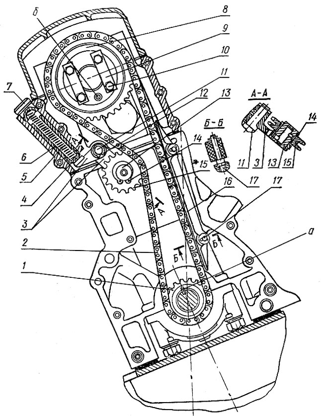Привод газораспределительного механизма автомобиля 'Москвич-412': 1 - ведущая звездочка; 2 - цепь; 3 - двуплечий рычаг; 4 - сухарь плунжера; 5 - натяжная пружина; 6 - плунжер; 7 - пробка; 8 - ведомая звездочка; 9 - стопорная пластина; 10 - болт; 11 и 13 - оси; 12 и 14 - пружинные кольца; 15 - натяжная звездочка; 16 - успокоитель цепи; 17 - ось успокоителя; а - шпонка; б - штифт распределительного вала.