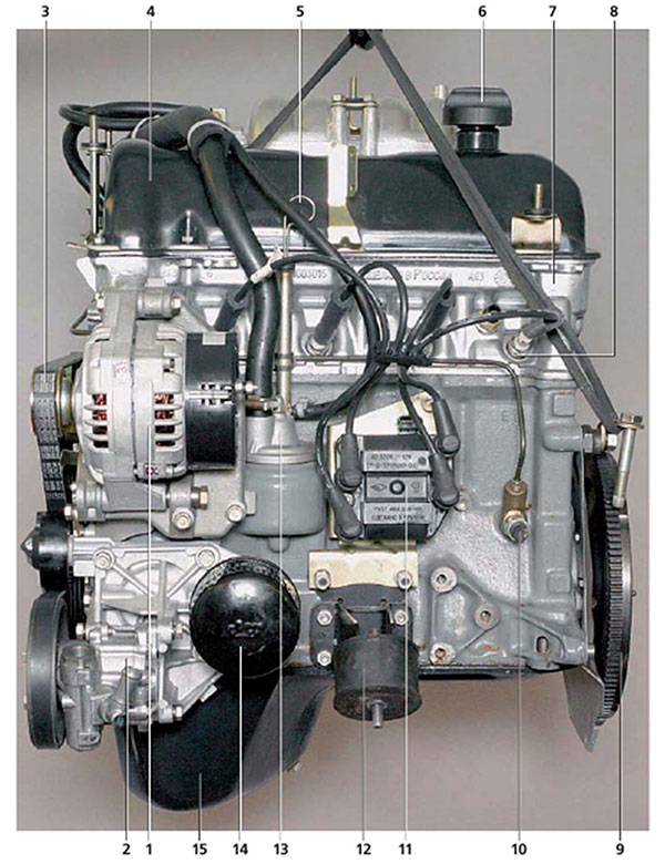 Вид на двигатель ВАЗ-2123 слева: 1 — генератор; 2 — насос гидроусилителя рулевого управления; 3 — ремень привода вспомогательных агрегатов; 4 — крышка головки блока цилиндров; 5 — измерительный щуп уровня масла; 6 — крышка маслозаливной горловины; 7 — головка блока цилиндров; 8 — свеча зажигания; 9 — маховик; 10 — датчик контрольной лампы недостаточного давления масла; 11 — модуль зажигания; 12 — левая опора силового агрегата; 13 — маслоотделитель системы вентиляции картера; 14 — масляный фильтр; 15 — поддон картера.