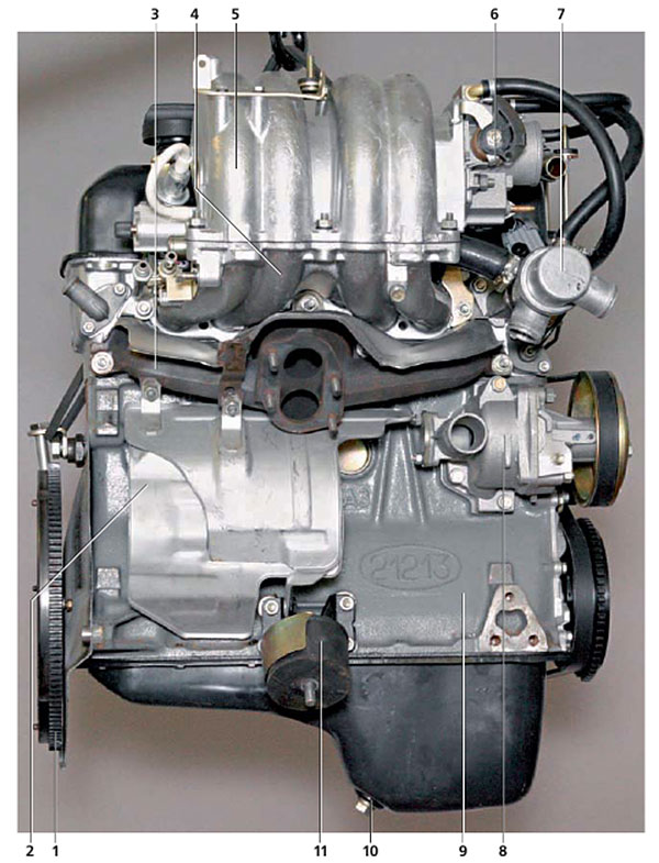Вид на двигатель ВАЗ-2123 справа: 1 — маховик; 2 — щиток стартера; 3 — выпускной коллектор; 4 — впускная труба; 5 — ресивер; 6 — корпус дроссельной заслонки; 7 — термостат; 8 — насос охлаждающей жидкости; 9 — блок цилиндров; 10 — пробка сливного отверстия поддона картера; 11 — правая опора силового агрегата.