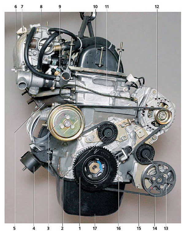 Вид на двигатель ВАЗ-2123 спереди: 1 — шкив коленчатого вала; 2 — натяжной ролик ремня привода вспомогательных агрегатов; 3 — шкив насоса охлаждающей жидкости; 4 — опора силового агрегата; 5 — выпускной коллектор; 6 — ресивер; 7 — термостат; 8 — корпус дроссельной заслонки; 9 — отводящий патрубок рубашки охлаждения; 10 — крышка головки блока цилиндров; 11 — головка блока цилиндров; 12 — генератор; 13 — опорный ролик ремня привода вспомогательных агрегатов; 14 — шкив насоса гидроусилителя рулевого управления; 15 — ремень привода вспомогательных агрегатов; 16 — датчик положения коленчатого вала; 17 — поддон картера.