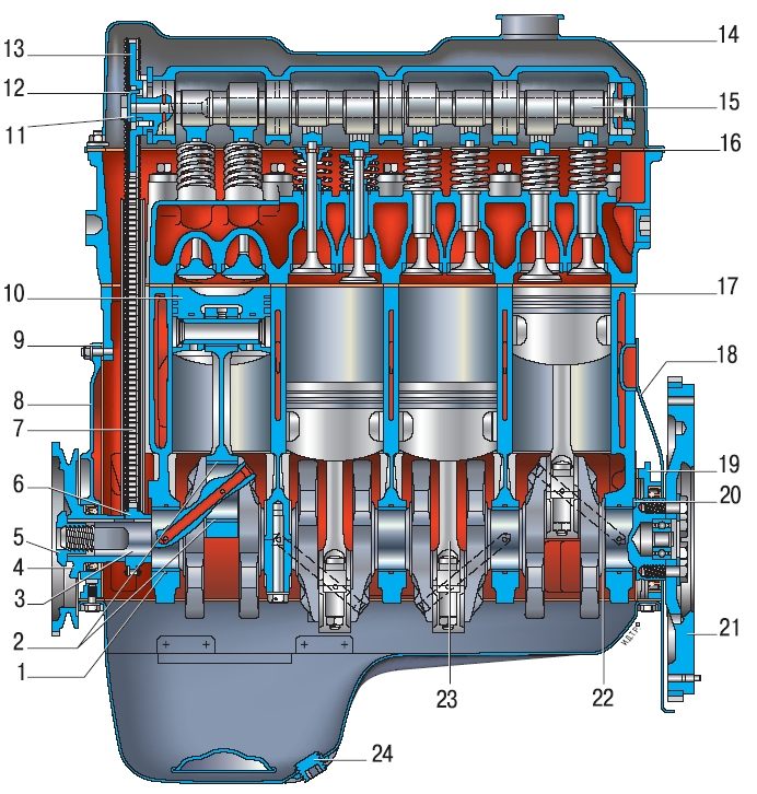 Продольный разрез двигателя Нива Шевроле: 1 – вкладыш коренного подшипника; 2 – вкладыш шатунного подшипника; 3 – коленчатый вал; 4 – шкив коленчатого вала; 5 – гайка крепления шкива; 6 – звездочка коленчатого вала; 7 – цепь привода газораспределительного механизма; 8 – крышка привода газораспределительного механизма; 9 – прокладка крышки; 10 – поршень; 11 – упорная шайба; 12 – стопорная шайба; 13 – звездочка распределительного вала; 14 – крышка головки блока цилиндров; 15 – распределительный вал; 16 – прокладка крышки головки блока цилиндров; 17 – блок цилиндров; 18 – крышка картера сцепления; 19 – держатель заднего сальника; 20 – внешнее упорное полукольцо коленчатого вала; 21 – маховик; 22 – внутреннее упорное полукольцо коленчатого вала; 23 – шатун; 24 – пробка маслосливного отверстия.