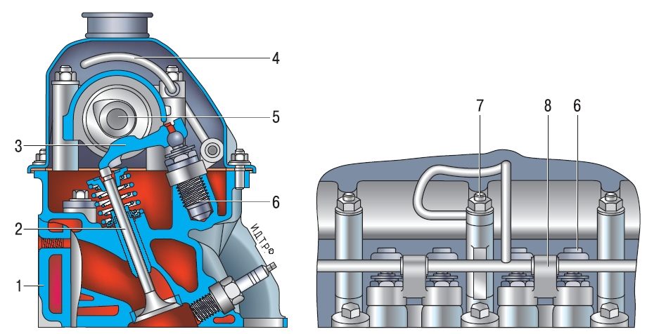 Механизм газораспределения Нива Шевроле: 1 – головка блока цилиндров; 2 – клапан; 3 – рычаг привода клапана; 4 – трубка подвода масла к гидроопорам; 5 – распределительный вал; 6 – гидроопора рычага привода клапана; 7 – гайка крепления корпуса подшипников распределительного вала и трубки подвода масла к гидроопорам; 8 – стойка рампы подвода масла к гидроопорам.