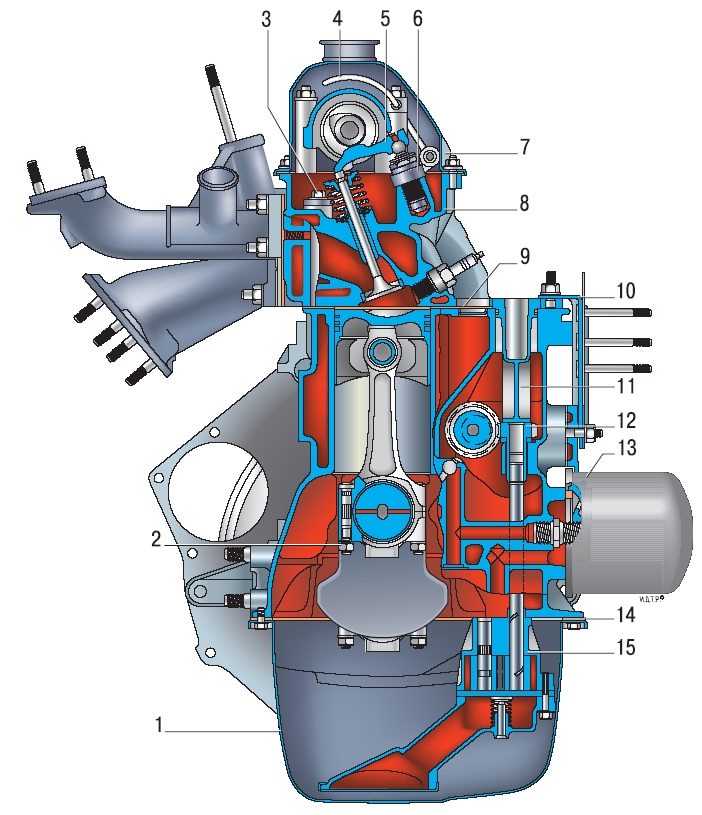 Поперечный разрез двигателя Шеви Нива: 1 – масляный картер; 2 – гайка шатунного болта; 3 – болт крепления головки блока цилиндров; 4 – трубка подвода масла к гидроопорам; 5 – рычаг привода клапана; 6 – гидроопора; 7 – крышка головки блока цилиндров; 8 – головка блока цилиндров; 9 – прокладка головки блока цилиндров; 10 – кронштейн крепления модуля зажигания; 11 – заглушка; 12 – шестерня привода масляного насоса; 13 – масляный фильтр; 14 – прокладка масляного картера; 15 – масляный насос.