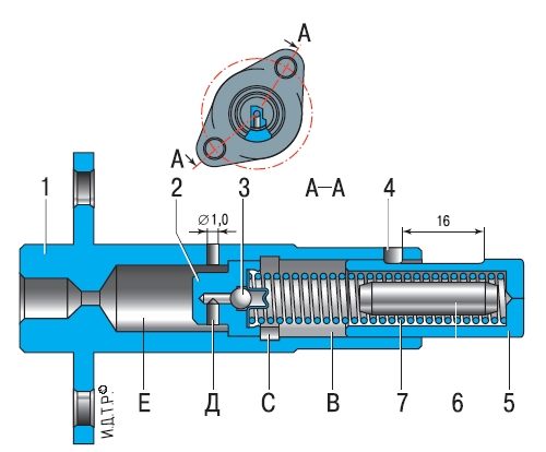 Натяжитель цепи привода распределительного вала Шевроле Нива: 1 – корпус; 2 – клапанный узел; 3 – шарик обратного клапана; 4 – ограничительный штифт; 5 – плунжер натяжителя; 6 – ограничитель объема; 7 – пружина плунжера; В – рабочая полость; С – установочный паз; Д – подающее от верстие; Е – резервная полость.