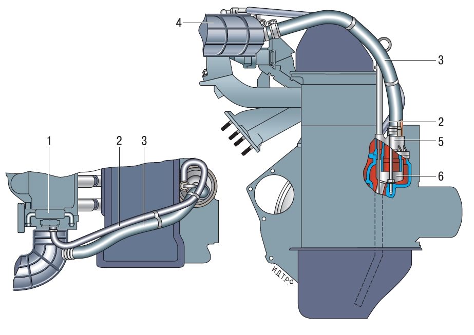 Схема системы вентиляции картера Шевроле Нива (слева – вид сверху): 1 – дроссельный узел; 2 – шланг первого контура; 3 – шланг второго контура; 4 – воздухоподводящий патрубок; 5 – крышка сапуна; 6 – маслоотделитель.