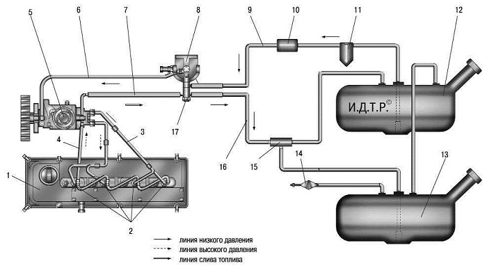 Схема топливной системы УАЗ Хантер дизель ЗМЗ 5141 – двигатель; 2 – форсунки; 3 – топливопроводы высокого давления двигателя; 4 – шланг отвода отсечного топлива от форсунок к ТНВД; 5 – ТНВД; 6 – шланг подвода топлива от фильтра тонкой очистки топлива к ТНВД; 7 – шланг слива топлива от ТНВД к штуцеру фильтра тонкой очистки топлива; 8 – фильтр тонкой очистки топлива; 9 – топливопровод забора топлива от баков; 10 – топливный электронасос; 11 – фильтр грубой очистки топлива; 12 – правый топливный бак; 13 – левый топливный бак; 14 – клапан топливного бака; 15 – струйный насос; 16 – топливопровод слива топлива в баки; 17 – перепускной клапан. Запрещается полностью вырабатывать топливо из системы питания, так как смазка трущихся деталей ТНВД осуществляется топливом, а при полной выработке топлива ТНВД выйдет из строя.ТНВД является высокоточным изделием, поэтому его ремонт рекомендуется проводить только в специально оборудованных для этих работ мастерских и станциях технического обслуживания автомобилей.УАЗ Hunter TD (Переносим топливный фильтр ЗМЗ - 514) - видео