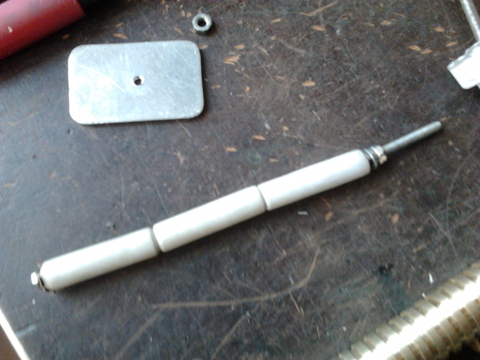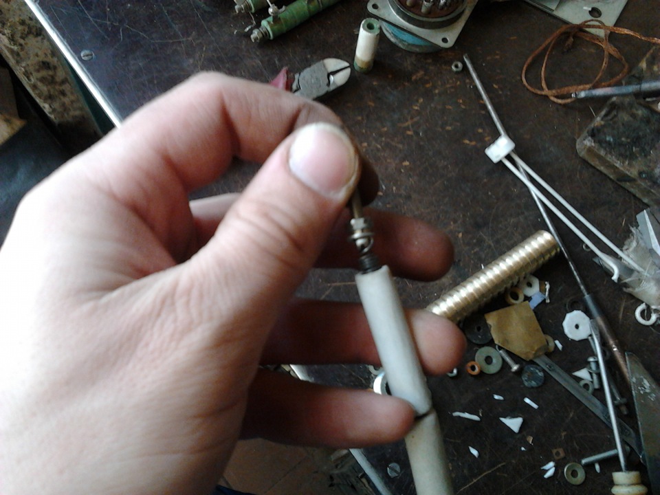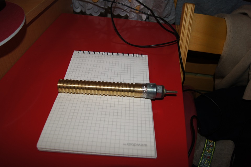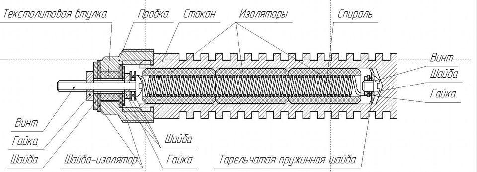 Нагревательный элемент — нихромовая проволока сечением 0.6 мм длинной около 2-метров навитая на оправку 4мм. Длинна в навитом состоянии 110 мм. Сопротивление элемента около 1 Ома. Изоляторы — корпуса керамических предохранителей с наружным диаметром 10 мм и внутренним 5.5мм.