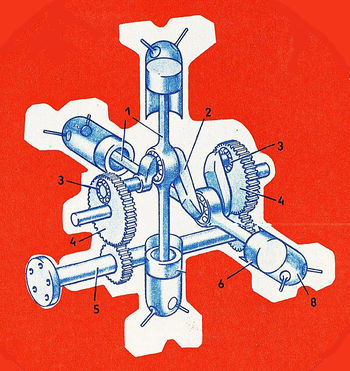 Преобразование возвратно-поступательного движения поршневой группы во вращательное движение осуществляет механизм, который основан на кинематике "точного прямила". То есть, два поршня соединены жестко штоком, воздействующим на коленчатый вал, вращающийся с зубчатыми венцами в кривошипах.Удачное решение задачи нашел советский инженер С. Баландин. В 40 - 50-х годах он спроектировал и построил несколько образцов авиамоторов, где шток, который соединял поршни с преобразующим механизмом, не делал угловых качаний. Такая бесшатунная конструкция, хотя и была в некоторой степени сложнее механизма, занимала меньший объем и на трение обеспечивала меньшие потери. Надо отметить, что аналогичный по конструкции двигатель испытывался в Англии в конце двадцатых годов. Но заслуга С. Баландина состоит в том, что он рассмотрел новые возможности преобразующего механизма без шатуна. Поскольку шток в таком двигателе не качается относительно поршня, тогда можно с другой стороны поршня тоже пристроить камеру сгорания с конструктивно несложным уплотнением штока проходящего через ее крышку.