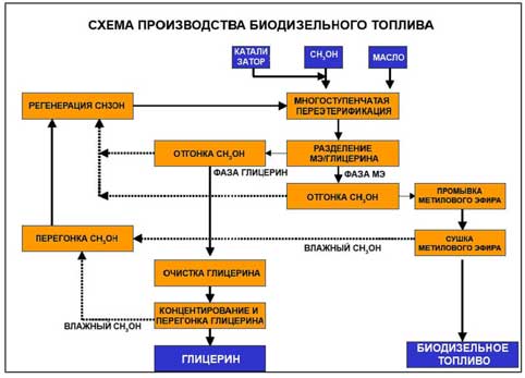 Механизм получения биодизеля заключается в проведении реакции этерификации – взаимодействия жирных кислот с метиловым спиртом в присутствии катализатора (щелочного или кислотного). Соотношение растительного масла и метанола составляет приблизительно 9:1.Реакция начинается медленно и в зависимости от перемешивания занимает всего 3–6 минут. Чтобы получить хороший выход биодизеля ее необходимо провести дважды. Затем все это декантируется: глицерин – на дне, и верхняя фракция – эфир – передается на вторую стадию реакции. Снова простое смешивание с метанолом и катализатором в течение нескольких минут завершит процесс этерификации, и второй статический декантер разделит фракции глицерина и эфира. Реакция идет при любой температуре, т. е. диапазон от 20 oС до 90 oС является приемлемым. Каждые 10 oС удваивают скорость реакции, некоторые источники рекомендуют температуру 55 oС для повышенной безопасности процесса, так как метанол закипает при 65 oС. Из одной тонны растительного масла и 111 кг спирта (в присутствии 12 кг катализатора) получается приблизительно 970 кг (1100 л) биодизеля и 153 кг первичного глицерина.