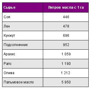 Для производства биодизеля подходят любые растительные масла, твердые масла животного происхождения, отходы масложирового производства или скотобоен. В качестве растительных масел могут использоваться подсолнечное, рапсовое, льняное и др. В зависимости от используемого сырья качественные показатели биотоплива разнятся. Так, например пальмовый биодизель имеет наибольшую калорийность, но быстро замерзает при относительно высоких температурах. Рапсовый биодизель несколько уступает пальмовому по калорийности, но лучше переносит холод. Таблица. Объем производства растительного масла с 1 га некоторых сельхозкультурОптимальным сырьем для производства биодизеля служит рапс. Процент выхода дизельного топлива из 1 т рапсового масла – 96%. По удельному весу в мировом производстве масличных культур рапс занимает третье место после сои и хлопка, опередив подсолнечник. Различают рапс двух сортов – озимый и яровой с несколько различными показателями урожайности и масличности. Урожайность маслосемян сортов озимого рапса может достигать 60 ц с га, а яровых сортов – 45 ц с га. Среднее содержание масла в семенях – 40–50%. Рапс является отличной культурой для севооборота с пшеницей. Он хорошо структурирует почву, в результате повышение урожайности зерновых, посеянных после рапса, составляет до 10–15 ц с га.