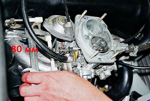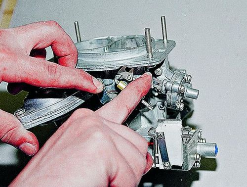 2. Если работу проводите, не вынимая карбюратор из автомобиля, вытяните «подсос». Если же устройство у вас в руках, жмите на трехплечий рычаг. После того, как заслонка полностью закрылась, тягу до упора утапливаем его.