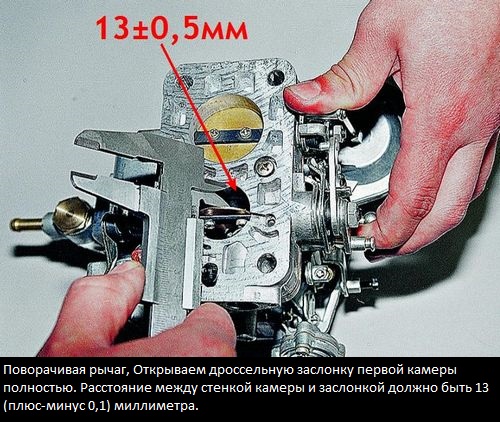 6. Теперь нужно проверить расстояние между камерой и дроссельной заслонкой. Требуемый размер – 1 миллиметр. Для этого подойдет сверло с подобным диаметром. Настройка зазора производится с помощью тяги, которая либо переставляется в иное отверстие, либо подгибается.