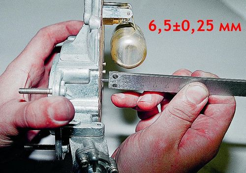 Прежде, чем приступить к этим работам, нужно убедиться, что игольчатый клапан работает надежно. 1. Делаем замер между поплавком и прокладкой. Это расстояние должно быть 6,5 миллиметра. Допускается небольшое отклонение в 0,25 миллиметра. Также можно просто использовать подходящее сверло для замера.