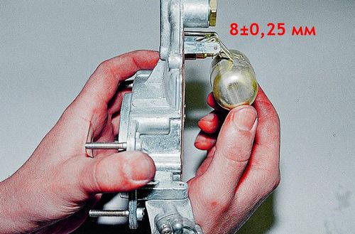 3. Поплавок отворачиваем до упора. Замеряем расстояние до прокладки в этом положении. Оно должно быть равным 8 миллиметрам. С помощью язычка добиваемся нужного значения.