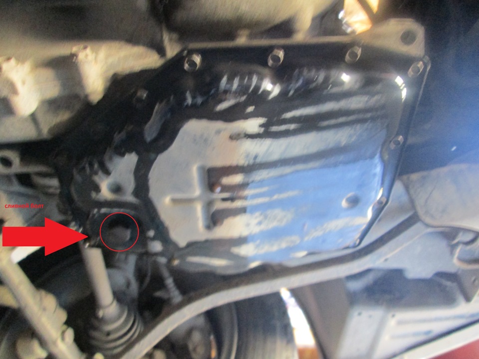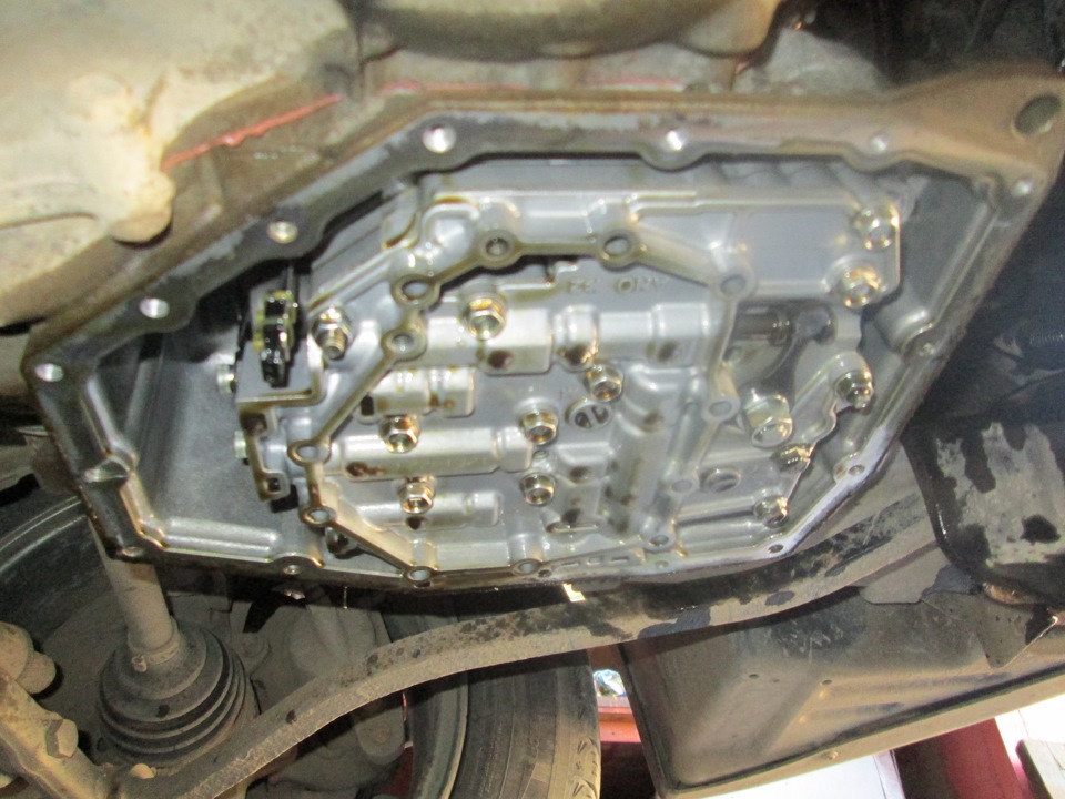 21. Чистим поддон, магниты и фильтр. Я использовал очиститель для тормозов и тряпку. 22. Ставим обратно фильтр и поддон. Очень внимательно и аккуратно закручиваем болты дабы не сорвать резьбу. Закручиваем сливную пробку. 23. Меряем сколько всего слилось масла и заливаем смело столько же, НЕ ЗАБЫВАЕМ УЧЕСТЬ РАНЕЕ ЗАЛИТЫЕ 0,5 – 0,6 Л. 24. ЗАВОДИМ И ГОНЯЕМ КОРОБКУ ПО ПЕРЕДАЧАМ С ЗАДЕРЖКОЙ НА КАЖДОЙ СЕКУНД ПО 10. 25. Прогреваем машину до рабочей температуры. 26. Прогоняем коробку ещё пару раз. 27. Не глуша авто и на нейтральной передаче проверяем уровень масла (на щупе шкала «HOT») 29. При необходимости долить, глушим мотор и доливаем порциями по 100-200 мл. Заводим и снова прогоняем по передачам и проверяем. ВНИМАНИЕ масло будет прозрачного цвета, смотрим внимательно на щуп. 30. Как уровень будет на минимуме или желательно чуть выше минимума, ставим воздушный фильтр обратно, пластиковый фартук, защиту и катаемся примерно 10 км. 31. Потом снова проверяем уровень, так же отодвинув фильтр в сторону, по-другому я честно говоря не представляю, как добраться до щупа. 32. Если надо доливаем, так же порциями по 100-200 мл. 33. У меня уровень на прогретой машине немного выше середины между минимумом и максимумом. На все про все у меня ушло три канистры и 600 мл. Почему именно так, да потому что в канистрах не по 1 литру, а по 946 мл. Ну можно сказать 3,5л. Грубо. Всем ровных дорог, если что не понятно спрашиваем не стесняемся.