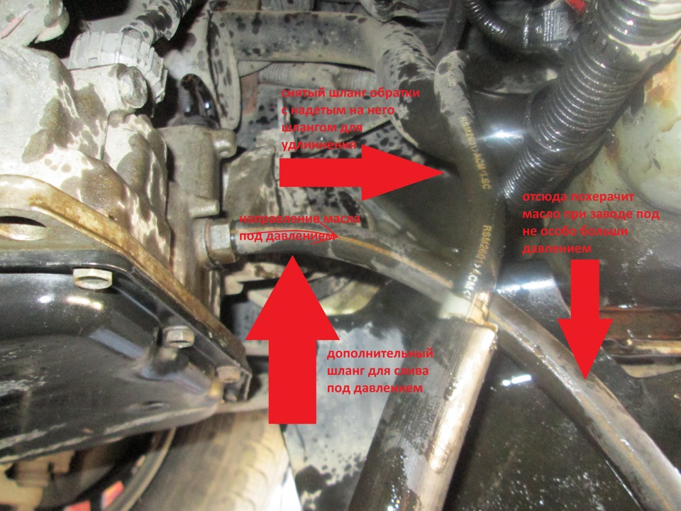 12. Отсоединяем шланг обратки от коробки, немного сольётся ещё. 13. Наращиваем шланг обратки, любым из доступных способов. 14. Одеваем на штуцер от коробки, с которого только что сняли шланг обратки, заранее подготовленный запасной шланг. 15. Направляем все это дело в емкость для слива масла.