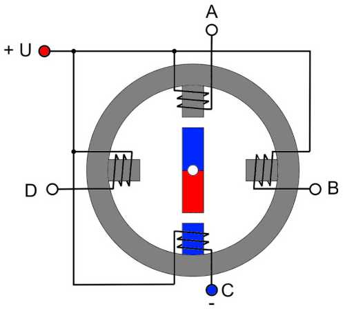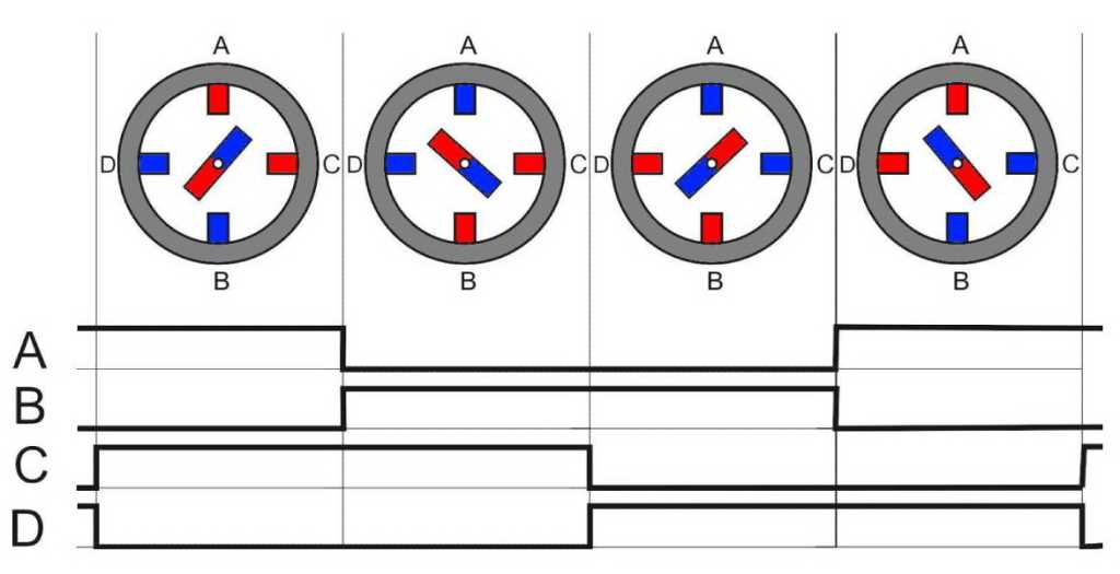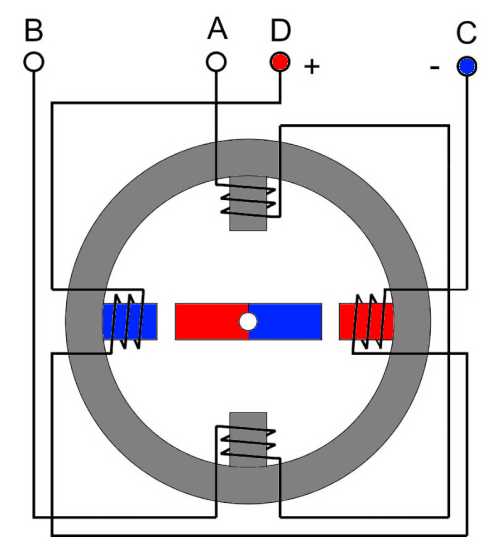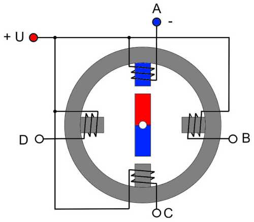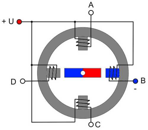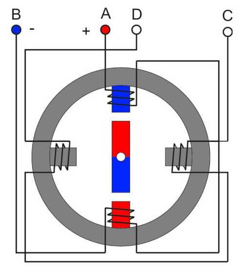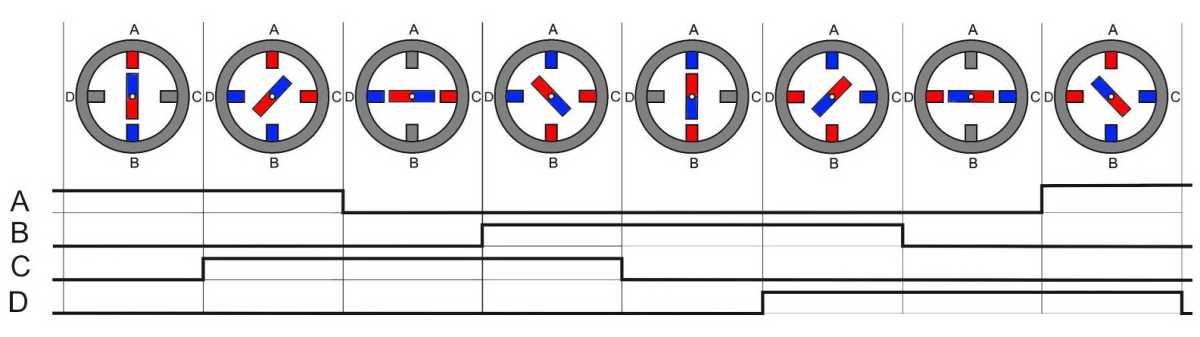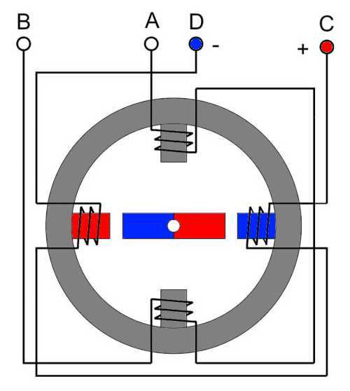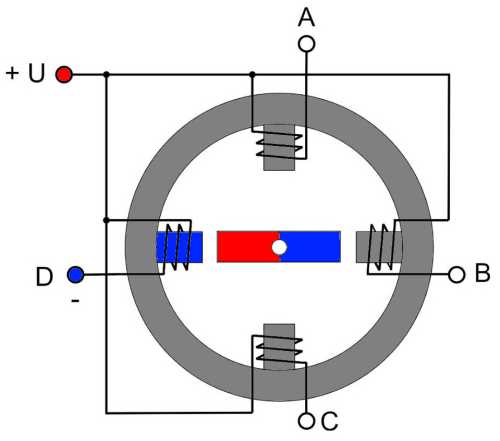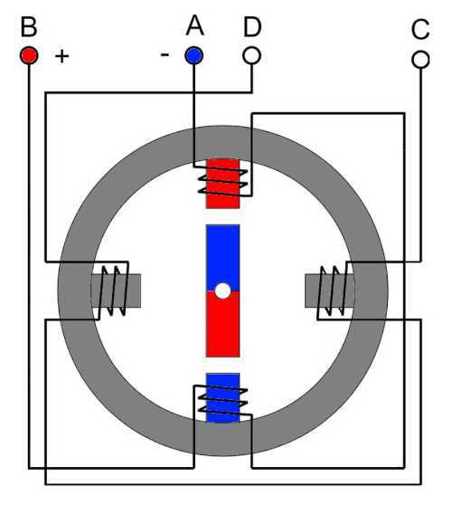 Еще одна коммутация AB - отключаем, CD - подключаем (полярность - +) и ротор совершает еще один шаг на одну четвертую окружности. Следующая коммутация (с которой мы начали) вернет ротор в исходное положение. Мы сделали полный поворот за 4 шага. Если продолжить переключение фаз, ротор будет вращаться с частотой, пропорциональной частоте переключения фазных обмоток. Если коммутировать фазы в противоположной последовательности – крутиться в обратном направлении, прекратить коммутацию - остановится.