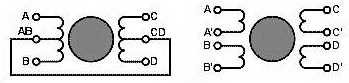 Для коммутации обмоток таким способом достаточно четырех ключей, замыкающих обмотки на землю. Ключи часто управляются непосредственно с выводов микроконтроллеров. Иногда средние выводы обмоток конструктивно объединены внутри двигателя, иногда выводятся все выводы отдельно. Кстати, это не повод называть двигатель четырехфазным. Все равно он будет двухфазным.
