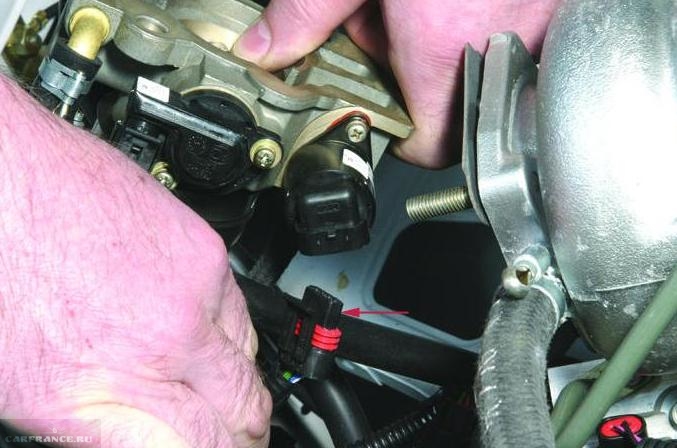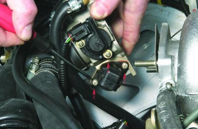 Для того, чтобы демонтировать регулятор холостого хода, вам потребуются некоторые инструменты, такие как головка на «13», крестообразную отвёртку и плоскогубцы. 1. Первым делом обеспечиваем автомобилю стоянку на ровной поверхности, ставим её на ручник и при необходимости устанавливаем противооткатные упоры. 2. Далее, открываем капот, отключаем минусовую клемму с аккумуляторной батареи. 3. Следующим шагом будет, выкручивание гаек крепления и демонтажа шпилек с ресивера от дроссельной заслонки. Обратите внимание, что отсоединять патрубки адсорбера, охлаждающей жидкости и вентиляции картера нет необходимости. 4. Затем отключаем разъём с проводами от РХХ.5. Воспользовавшись крестовой отвёрткой, выкручиваем винты, которые фиксируют регулятор на дроссельной заслонке.