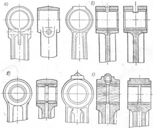 Профили стержня шатуна: а) двутавровый; б) крестообразный; в) трубчатый; г) круглыйВерхняя головка обычно имеет форму, близкую к цилиндрической, но особенности ее конструкции в каждом конкретном случае выбираются в зависимости от методов фиксации поршневого пальца и его смазки. Если поршневой палец закрепляется в поршневой головке шатуна, то ее делают с разрезом, как показано на рис. 2, а. Под действием стяжного болта стенки головки несколько деформируются и обеспечивают глухую затяжку поршневого пальца. Головка при этом не работает на износ и выполняется с относительно небольшой длиной, равной примерно ширине наружной полки стержня шатуна. С точки зрения выполнения монтажно-демонтажных работ предпочтительнее боковые разрезы, но использование их приводит к определенному увеличению размеров и веса головки. Верхние головки с креплением в них поршневых пальцев применялись на шатунах старых моделей рядных двигателей ЗИЛ, например, на 5 и 101 моделях.Рис. 2. Верхняя головка шатунаПри других методах фиксации поршневых пальцев в верхнюю головку шатуна в качестве подшипника запрессовывают втулки из оловянистой бронзы с толщиной стенок от 0,8 до 2,5 мм (см. рис. 3, б, в, г). Тонкостенные втулки изготовляют свертными из листовой бронзы и обрабатывают под заданный размер поршневого пальца после запрессовки в головку шатуна. Свертные втулки применяют на всех двигателях автомобилей ГАЗ, ЗИЛ-130, МЗМА и др.Втулки верхней головки шатунов смазывают разбрызгиванием или под давлением. В автомобильных двигателях широкое распространение получила смазка разбрызгиванием. Капельки масла при такой простейшей системе смазки попадают в головку через одно или несколько больших с широкими фасками на входе масло-улавливающих отверстий (см. рис. 2, б) или через глубокую прорезь, сделанную фрезой со стороны, противоположной стержню. Подачу масла под давлением применяют только в двигателях, работающих с повышенной нагрузкой на поршневые пальцы. Масло подводится из общей системы смазки через канал, просверленный в стержне шатуна (см. рис. 2, б), или по специальной трубке, устанавливаемой на стержне шатуна. Смазка под давлением применяется в двух- и четырехтактных дизелях ЯМЗ. Двухтактные дизели ЯМЗ, работающие со струйным охлаждением днища поршней, имеют на верхней головке шатуна специальные форсунки для подачи и распыливания масла (см. рис. 2, г). Малая головка шатуна снабжается здесь двумя толстостенными литыми бронзовыми втулками, между которыми образуется кольцевой канал для подвода масла к форсунке-распылителю из канала в стержне шатуна. Для более равномерного распределения смазочного масла на поверхностях трения втулок нарезаются спиральные канавки, а дозирование масла осуществляют с помощью калиброванного отверстия в пробочке 5, которую запрессовывают в канал стержня шатуна, как показано на рис. 4, б.
