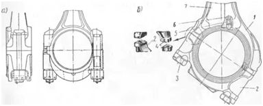 Рис. 4. Нижняя головка шатуна: а) с прямым разъемом; б) с косым разъемом; 1 — половина головки, отковываемая совместно со стержнем 7; 2 — крышка головки; 3 — болт шатуна; 4 — треугольные шлицы; 5 — втулочка с калиброванным отверстием; 6 — канал в стержне для подвода масла к поршневому пальцу. Для двигателей автомобильного типа с характерной совместной отливкой цилиндра и картера в одном блоке и вообще при наличии блок-картерной отливки остова двигателя желательно, что бы большая головка шатуна свободно проходила через цилиндры и не затрудняла выполнение монтажно-демонтажных работ. Когда габариты этой головки развиты так, что она не проходит в отверстие цилиндровой гильзы 2 (см. рис. 3), то комплект шатуна в сборе с поршнем 1 (см. рис. 3) можно свободно установить на место только при снятом коленчатом вале, что создает крайние неудобства при ремонте (Иногда поршень без уплотнительных колец, но собранный с шатуном удается просунуть за смонтированный коленчатый вал и вставить его в цилиндр со стороны картера (или, наоборот, вынуть из цилиндра через картер), а потом завершать сборку поршневой группы и шатуна, затрачивая на все это непроизводительно много времени). Поэтому развитые нижние головки выполняют с косым разъемом, как сделано это в дизеле ЯМЗ-236 (см. рис. 4, б). Плоскость косого разъема головки обычно располагают под углом 45гр. к продольной оси стержня шатуна (в отдельных случаях возможен угол разъема 30 или 60гр.). Габариты таких головок после удаления крышки резко уменьшаются. При косом разъеме крышки чаще всего крепятся болтами, которые ввертываются в основную половину головки. Реже для этой цели применяют шпильки. В отличие от нормальных разъемов, выполняемых под углом 90гр. к оси стержня шатуна (см. рис. 4, а), косые разъемы головок (см. рис. 4, б) позволяют несколько разгружать шатунные болты от разрывающих усилий, а возникающие при этом боковые усилия воспринимаются буртиками крышки или треугольными шлицами, сделанными на стыкующихся поверхностях головки. У разъемов (нормальных или косых), а также под опорными плоскостями шатунных болтов и гаек стенки нижней головки обычно снабжают упрочняющими приливами и утолщениями. В головках автомобильных шатунов с нормальной плоскостью разъема в подавляющем большинстве случаев шатунные болты одновременно являются установочными, точно фиксирующими положение крышки относительно шатуна. Такие болты и отверстия под них в головке обрабатывают с высокой чистотой и точностью, как установочные штифты или втулки. Шатунные болты или шпильки являются исключительно ответственными деталями. Обрыв их связан с аварийными последствиями, поэтому они изготовляются из высококачественных легированных сталей с плавными переходами между элементами конструкции и подвергаются термообработке. Стержни болтов выполняются иногда с проточками в местах перехода к резьбовой части и около головок. Проточки делают без подрезов с диаметром, равным примерно внутреннему диаметру резьбы болта (см. рис. 3 и 4). Шатунные болты и гайки к ним у ЗИЛ-130 и некоторых других автомобильных двигателей изготовляются из хромо-никелевой стали марки 40ХН. Применяются для этих целей также стали 40Х, 35ХМА и аналогичные им материалы. Чтобы предотвратить возможное проворачивание шатунных болтов при затягивании гаек, их головки делают с в