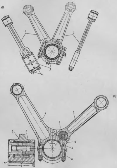 Рис. 5. Сочлененные шатуны: а) вильчатой конструкции, б) с прицепным шатуном У вильчатых шатунов (см. рис. 5, а), используемых иногда в двухрядных двигателях, оси больших головок совпадают с осью шейки вала, в связи с чем их называют также центральными. Большая головка главного шатуна 1 имеет вильчатую конструкцию; а головка вспомогательного шатуна 2 устанавливается в развилку главного шатуна. Его называют поэтому внутренним, или средним, шатуном. Оба шатуна имеют разъемные нижние головки и снабжаются общими для них вкладышами 3, которые от проворачивания чаще всего фиксируются штифтами, расположенными в крышках 4 вильчатой головки. У зафиксированных таким образом вкладышей внутренняя поверхность, соприкасающаяся с шейкой вала, полностью покрывается антифрикционным сплавом, а наружная — только в средней части, т. е. в зоне размещения вспомогательного шатуна. Если вкладыши не фиксируются от проворачивания, то поверхности их с обеих сторон полностью покрываются антифрикционным сплавом. В этом случае вкладыши изнашиваются более равномерно. Центральные шатуны обеспечивают одинаковую величину хода поршней во всех цилиндрах V-образного двигателя, как и обычные одинарные шатуны. Однако комплект их довольно сложен в производстве, а вилке не всегда удается придать нужную жесткость. Конструкции с прицепным шатуном проще в производстве и обладают надежной жесткостью. Примером такой конструкции может служить шатунный узел дизеля В-2, показанный на рис. 5, б. Он состоит из главного 1 и вспомогательного прицепного 3 шатунов. Главный шатун имеет верхнюю головку и двутавровый стержень обычной конструкции. Нижняя его головка снабжена тонкостенными вкладышами, залитыми свинцовистой бронзой, и выполнена с косым разъемом относительно стержня главного шатуна; иначе ее нельзя скомпоновать, так как под углом 67° к оси стержня на ней размещают две проушины 4, предназначенные для крепления прицепного шатуна 3. Крышка главного шатуна крепится шестью шпильками 6, завернутыми в тело шатуна, причем от возможного проворачивания они фиксируются штифтами 5. Прицепной шатун 3 имеет двутавровое сечение стержня; обе головки его неразъемны и поскольку условия их работы аналогичны, то они снабжены бронзовыми подшипниковыми втулками. Сочленение прицепного шатуна с главным осуществляется при помощи полого пальца 2, закрепленного в проушинах 4. В конструкциях V-образных двигателей с прицепным шатуном последний располагают относительно стержня главного шатуна справа по вращению вала, чтобы уменьшить боковое давление на стенки цилиндра. Если при этом угол между осями отверстий в проушинах крепления прицепного шатуна и стержня главного шатуна больше угла развала между осями цилиндров, то ход поршня прицепного шатуна будет больше хода поршня главного шатуна. Объясняется это тем, что нижняя головка прицепного шатуна описывает не окружность, как головка главного шатуна, а эллипс, большая ось которого совпадает с направлением оси цилиндра, поэтому у поршня прицепного шатуна 5 > 2г, где 5 — величина хода поршня, а г — радиус кривошипа. Например, у дизеля В-2 оси цилиндров расположены под углом 60гр., а оси отверстий в проушинах 4 пальца нижней (большой) головки прицепного шатуна и стержня главного шатуна — под углом 67гр., вследствие чего разница в величине хода поршне