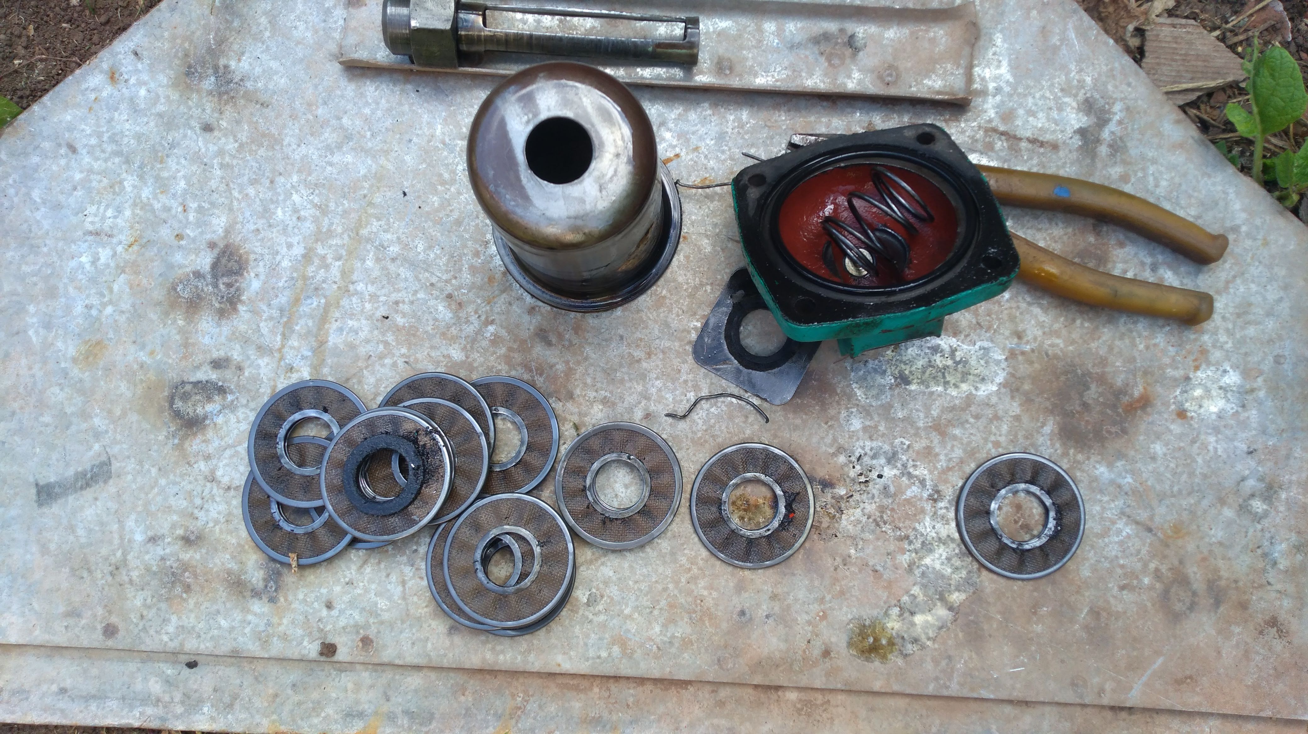 6. После промывки надеваем все секции обратно на шток (секции с резиновыми вставками должны быть одна снизу, а вторая сверху и должны плотно прилегать). 7. Вставляем собранный элемент обратно в стакан, устанавливаем новую прокладку под крышку, ставим прижимную пружину и прикручиваем крышку. 8. Есть еще сетчатый фильтр в штуцере всасывания (отвода) масла из гидробака (он тоже часто забивается). Его тоже необходимо снять и прочистить, но для этого необходимо слить масло из бака.