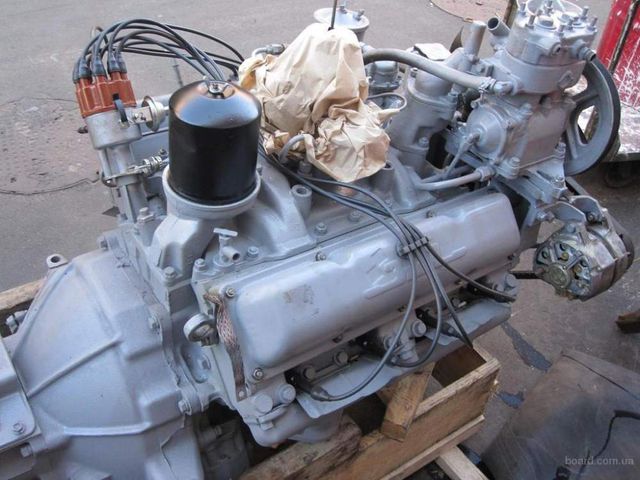 Четырехтактный восьмицилиндровый бензиновый с карбюраторной системой подачи топлива, V-образным (с двухрядным расположением) расположением цилиндров и поршнями (угол между рядами цилиндров равен - 90°), вращающими один общий коленчатый вал, с нижним расположением одного распределительного вала. Двигатель имеет жидкостную систему охлаждения закрытого типа с принудительной циркуляцией. Система смазки комбинированная: под давлением и разбрызгиванием.