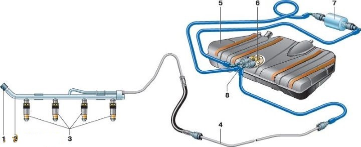 Есть несколько ситуаций, при которых можно грешить на насос или его составные части. Это придется проверить обязательно. Иначе вы можете потратить огромные деньги на покупку и установку нового топливного насоса, а в итоге окажется, что проблема заключается совершенно в другом. 1. Двигатель не заводится. Это не явный признак проблем именно с помпой, но все же. Потому для начала проверьте состояние свечей, наличие искры, отсутствие следов масла на них. Также проверьте электронный блок управления. 2. Давление внутри топливной системы. Если насос работает нормально, он будет создавать давление равное 3,2 бар. В зависимости от типа двигателя на вашем ВАЗ 2114, характеристики могут несколько отличаться: ➤ Для мотора объемом 1,5 литра оптимальные показатели составляют 285-325 кПа; ➤ Для двигателя объемом 1,6 литра эти характеристики в оптимальном режиме работы составят от 375 до 390 кПа. 3. Отсутствие сигнала, который не поступает на помпу. Происходит это при повороте ключа зажигания. При нормальной работе во время поворота ключа помпа начинает немного вибрировать. Если этого не происходит, обязательно проверьте проводку. 4. Троит силовой агрегат. Тоже не идеальный признак поломки именно топливной помпы. Но все же проверить придется. Вполне вероятно, что виновником сложившейся ситуации окажется насос. 5. Двигатель дергается. Причем происходит это на малых оборотах или даже при старте. Вероятных причин ситуации две — поломка самого насоса или проблемы с сеткой бензонасоса, которую придется заменить.Новый и старый фильтр грубой очистки (сетка топливного насоса ВАЗ 2114)Многие приобретают сразу весь топливный модуль в сборе, куда входит фильтр, датчик, поплавок, заборная камера и сама помпа. Такая покупка обойдется примерно в 3000 рублей. Куда выгоднее и практичнее купить отдельно насос, который стоит до 1000 рублей. Это обусловлено тем, что при выходе из строя помпы практически всегда остальные элементы остаются целыми и полностью пригодными к дальнейшей эксплуатации.1 – штуцер для проверки давления в системе питания; 2 – топливная рампа; 3 – форсунки; 4 – топливопровод; 5 – топливный бак; 6 – модуль топливного насоса (в топливном баке); 7 – топливный фильтр; 8 – тройник.