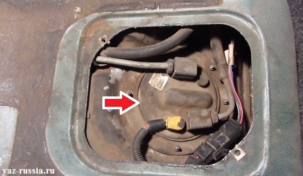 Во всех автомобилях самарского семейства, данный агрегат располагается во внутренней части бензобака, а бензобак в эту очередь установлен в нижней части автомобиля называемой в народе днище, а располагается этот самым бензобак в задней части автомобиля, то есть приблизительно где то под подушкой заднего сиденья и поэтому после откидывания данной подушки, очень легко можно будет разглядеть местонахождение бензонасоса, в данном случае на фото он указан стрелкой: