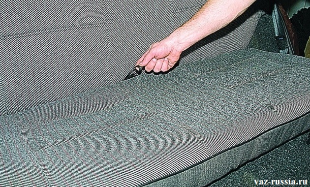 1. В самом начале операции отсоедините клему «-» от вывода аккумуляторной батареи. (О том как отсоединить клеме, читайте в статье: «Замена аккумулятора на ВАЗ» пункт 1) 2. Затем поднимите нижнюю подушку заднего сиденья, разыскав для этого язычок благодаря которому и можно поднять её.