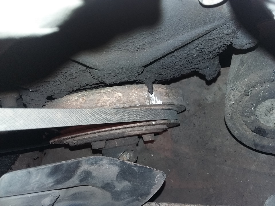 1. Выставляем ВМТ первого цилиндра прокручивая коленвал и установив метку на шкиву коленвала как показано на фото. Потом необходимо открутить свечу первого цилиндра и убедиться, что поршень действительно в верхней мертвой точке, то есть на верху.![]()