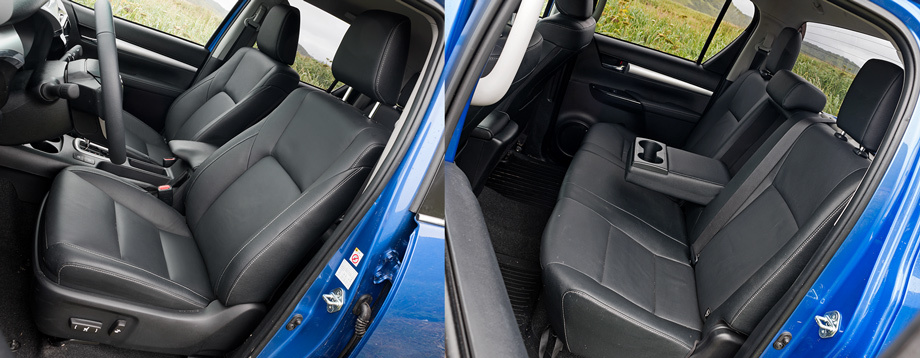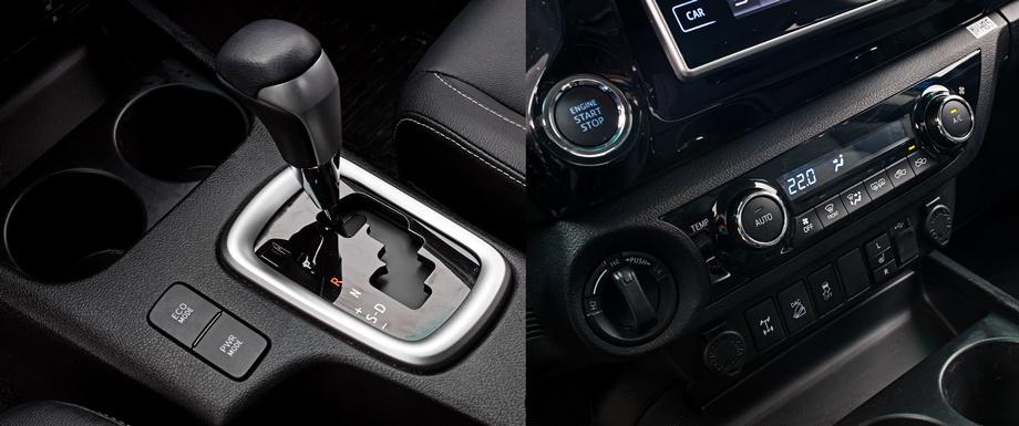 Приборы с синевой и дисплеем в центре читаются отлично. Пункты меню выбираются кнопками на правой спице руля. В Тойоте наивно сравнили семидюймовый центральный дисплей со «вторым» айпэдом, но если не тыкать в экран на кочках, то жить с ним можно.Новый дизель 2.8 тише прежнего: на холостых оборотах характерный перестук стал мягче, хотя под нагрузкой низкий приглушённый гул присутствует постоянно. Обгонов на скорости выше 100 км/ч Hilux не любит: жмёшь на газ — и ждёшь. Заминка именно моторная: шестиступенчатый «автомат» в отличие от старого пятиступенчатого работает живо и не требует спортивного или ручного режима. Отпускаешь газ — и тишина. Общая шумоизоляция пикапа на вполне кроссоверном уровне. Предназначение нового дизеля — размеренная езда и внедорожные «поползновения» на оборотах, близких к холостым: кажется, Hilux готов влезть на стену.