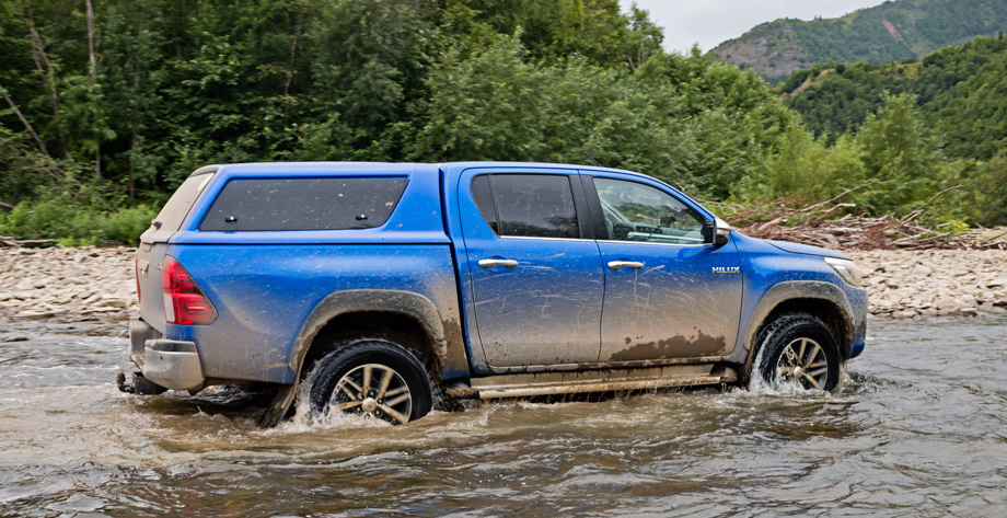 Заявленная глубина преодолеваемого брода — 700 мм (против 500 ранее), но мы лишь намочили шинки. Вместо расширителей колёсных арок, которые иной раз помогали прежнему пикапу сохранить кузов, у новинки лишь тонкие чёрные «наклейки» (на фото), и то — за доплату.
