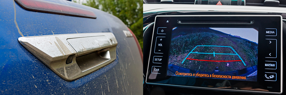 Камера заднего вида теперь не торчит пупырышком на откидном борте, а встроена в его ручку, но по-прежнему открыта грязи. Разметка на дисплее статичная.Электронную систему для облегчения подъёмов зовут HAC, для спусков — DAC, во всех модификациях Хайлакса предусмотрена система стабилизации прицепа TSC. А антипробуксовочная система A-TRC активная: при включении понижающей передачи 4L (передаточное число 2,566) подтормаживанием буксующих колёс она имитирует работу блокировок межколёсных дифференциалов. Вдобавок у пикапов с «механикой» есть функция iMT, которая поддерживает оптимальные обороты двигателя в момент выжима сцепления. В общем, справится и Дюймовочка.