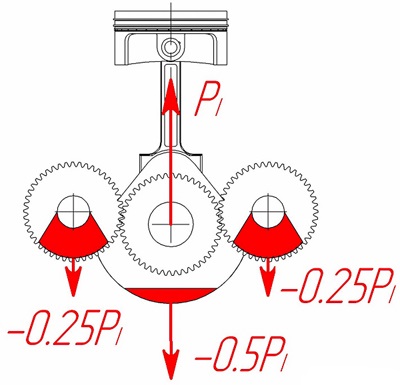 У одноцилиндровых двигателей при вращении коленчатого вала и движении поршня и шатуна возникают центробежные сшил и силы инерции первого и второго порядка. Силы инерции первого порядка (Рл) приблизительно пропорциональны массе ВПДЧ, радиусу кривошипа, квадрату угловой скорости коленчатого вала и косинусу его угла поворота. Массу ВПДЧ условно принимают равной массе поршня с кольцами и пальцем плюс масса верхней части шатуна (обычно примерно 30% от его полной массы). В зоне НМТ эта сила достигает максимума и направлена вниз (к коленчатому валу). В зоне ВМТ достигает наибольшей отрицательной величины и наоборот, как бы стремится оторвать поршень от коленчатого вала. При углах поворота 90 и 270 градусов эти силы равны нулю. Силы инерции второго порядка пропорциональны массе ВПДЧ, квадратам угловой скорости и радиуса кривошипа, косинусу удвоенного угла поворота коленчатого вала и обратно пропорциональны расстоянию между осями верхней и нижней головок шатуна (длине шатуна). Таким образом, по мере увеличения длины шатуна, силы инерции второго порядка стремятся к нулю. Но длина шатуна определяет высоту блока цилиндров. а следовательно, массу и габариты всего двигателя, поэтому длину шатуна стремятся делать минимальной, несмотря на увеличение сил инерции второго порядка. У большинства современных автомобильных двигателей отношение радиуса кривошипа к длине шатуна находится в пределах от 1: 3,0 до 1: 3,8. Силы инерции вращающихся масс пропорциональны сумме масс неуравновешенных частей колена вала и нижней части шатуна (обычно примерно 70% его полной массы) умноженной на радиус кривошипа и квадрат угловой скорости вращения коленчатого вала. Центробежные силы практически при любых схемах коленчатых валов удастся уравновесить противовесами на коленчатом валу.