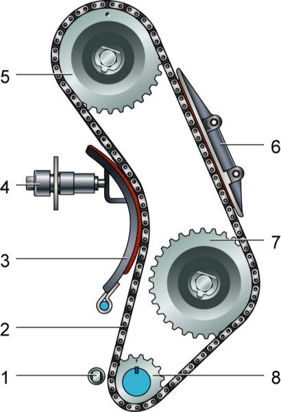 1 – ограничительный палец; 2 – цепь; 3 – башмак натяжителя; 4 – натяжитель цепи; 5 – звездочка распределительного вала; 6 – успокоитель цепи; 7 – звездочка валика привода масляного насоса; 8 – звездочка коленчатого вала. В первую очередь необходимо приобрести новую цепь газораспределительного механизма (ГРМ) для Нива Шевроле. Чтобы убедиться в ее качестве, положите деталь плашмя и подержите на весу. Если концы провиснут больше чем на 1 см или провисание будет неодинаковым, от покупки лучше отказаться – скорее всего, цепь уже поработала. Также придется купить: • три шестерни – коленвала, распредвала и маслонасоса; • башмак натяжителя цепи; • успокоитель; • натяжитель цепи Нива Шевроле; • датчик аварийной сигнализации давления масла; • лобовой сальник; • прокладку клапанной крышки и прокладку помпы.
