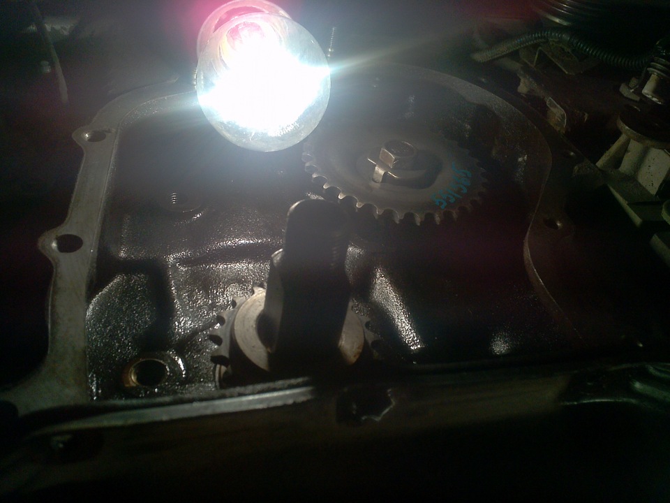 Завел башмак натяжителя, оперев опорную часть башмака на стену двигателя, легкими ударами молотка набил болт крепления башмака (некоторые предлагают пройтись круглым напильником, чтобы болт вставился от руки, но я категорически против, т.к. предварительно набив болт увидел что там точная посадка и башмак поворачивается на болту ровно без заеданий и люфтов. Если расточить — башмак будет болтаться на оси), закрутил болт на место, затянул. Башмак отвел к стенке двигателя, чтобы не мешал дальнейшей установке цепи. Установил звездочку коленвала. Установил звездочку маслонасоса (не забываем про дистанционную и стопорную шайбы, фиксирующий шип стопорной шайбы слегка подточил напильником, чтобы он плотно входил в паз звездочки, шип загнул под углом 90 гр), закрутил болт.