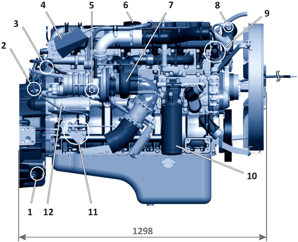 1. смотровой лючок механизма проворота коленчатого вала; 2. датчик частоты вращения коленчатого вала; 3. датчик давления и температуры масла; 4. управление заслонкой рециркуляции отработавших газов EGR; 5. датчик температуры охлаждающей жидкости; 6. система вентиляции картера; 7. турбокомпрессор; 8. датчик давления и температуры наддувочного воздуха; 9. пневмоклапан управления заслонкой EGR; 10. фильтр масляный; 11. пневмоклапан управления заслонкой моторного тормоза; 12. стартер.