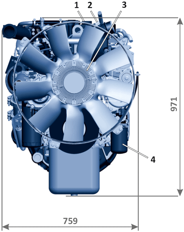 1. крышка маслозаливная; 2. датчик давления и температуры наддувочного воздуха; 3. вязкостная муфта включения вентилятора; 4. фильтр тонкой очистки топлива.